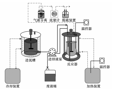 污泥厭氧消化采用完全混合式反應器(Completely Stirred Tank Reactors,CSTRs),試驗裝置如圖 1所示.反應器總容積為5 L,有效容積為4 L.進泥的投加與消化液的排出由時間控制器控制投料-排液蠕動泵(BT100-2J,保定蘭格)完成,每天進泥排泥各1次,每次200 mL;循環加熱裝置控制消化罐內溫度為(55±1)℃,循環加熱裝置為外循環溫控水浴加熱,采用冷卻泵外循環保持進泥槽溫度為4 ℃,進泥槽和各消化罐采用機械攪拌方式進行連續攪拌.產氣量經氣液分離裝置后用濕式氣體流量計測定.