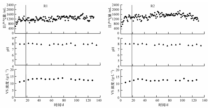 試驗是利用已經運行穩定的高溫厭氧消化反應器開展的,直接投加預處理后的基質,每日進、排泥各一次(200 mL),保持反應器在HRT=20 d條件下運行.18 d后日產氣量達到穩定狀態,系統啟動成功,系統運行穩定狀態達120 d以上.圖 2所示為反應器運行階段的日產氣量、消化液pH及VS情況,可看出R1和R2兩個反應器的日產氣量均在穩定范圍內波動,pH穩定在7.6~8.0之間,消化液VS也較穩定,說明反應器已處于穩定運行狀態.