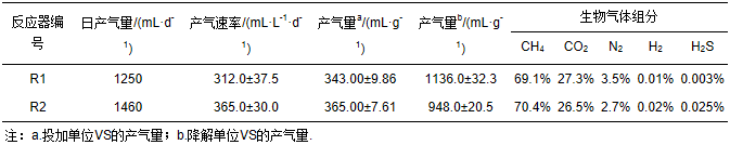 表 2為穩定狀態下各反應器的產氣狀況.從表 2可明顯看出,在HRT=20 d的條件下,不管是日產氣量、產氣速率,還是投加單位質量VS的產氣量,初沉污泥(R2)的數值均高于混合污泥(R1),這與污泥類型有較大關系.R2為未經降解的初沉污泥,其中含有大量的易被微生物利用的有機物,而R1中有一半的污泥是經過生物降解的剩余污泥,因此,R2的VS投加產氣量要高于R1.各反應器的CH4含量均在70%左右,H2S含量則在0.003%~0.025%之間.