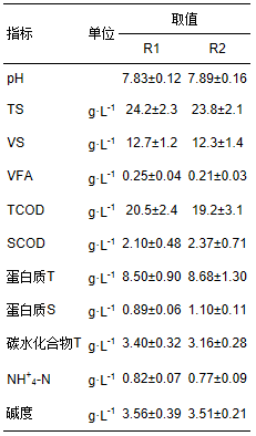 從表 3可以看出,各反應器pH均在7.8左右.厭氧消化過程中,NH+4-N濃度和堿度過高會對厭氧微生物產生抑制作),高溫消化時NH+4-N濃度超過2000 mg · L-1會導致VFA積累和產甲烷活性降).本試驗過程中NH+4-N濃度均維持在1000 mg · L-1以下,即在反應器運行過程中沒有發生NH+4-N抑制.研究表明,消化液堿度(以CaCO3計)在1000~5000 mg · L-1之間時厭氧反應可以穩定進),R1、R2消化液堿度在3400~3650 mg · L-1之間,說明反應器在穩定范圍內運行.