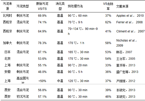 污泥中有機物含量的多少是影響污泥厭氧消化工藝的直接因素之一.不同地區由于氣候、環境、生活習慣不同使得不同城市的污水和污泥性質會有較大差異,尤其是其有機物含量.表 6列出了國內外一些污水處理廠的污泥泥質(VS/TS)及經預處理消化后VS的去除率情況.從表 6可以看出,研究者采用的熱解預處理條件不同,預處理溫度在70~170 ℃內變化,時間在20 min~9 h范圍內變化.一般來說,溫度越低所需預處理時間越長,低溫處理數小時可達到高溫短時預處理的效果,100 ℃以上的預處理效果明顯,但屬于高溫高壓操作,處理成本增大,對設備的要求提高.與國外相比較,國內污泥的VS/TS比值較低(普遍低于60%),無機物含量高,可生物降解的有機物含量則相對較少,這可能是造成國內厭氧消化產氣量低、有機物去除率低的主要原因之一.