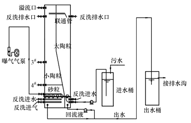 圖 1 分格復(fù)合填料曝氣生物濾池試驗(yàn)裝置及工藝流程圖