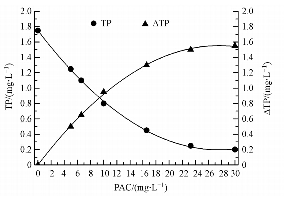 為使出水達(dá)到水質(zhì)排放的要求,向反應(yīng)器出水中投加一定量聚合氯化鋁(PAC),其有效含量為30%(以氧化鋁表示),用攪拌機(jī)快速混合1 min,慢慢攪拌15 min,沉淀30 min,取上清液測TP含量,結(jié)果如圖 4所示.