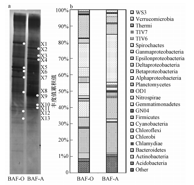 圖 5 BAF不同區(qū)段中細(xì)菌群落結(jié)構(gòu)(a)與組成(b)分析(BAF-O,BAF好氧段;BAF-A,BAF缺氧段; X1~X13,切取測序的條帶)