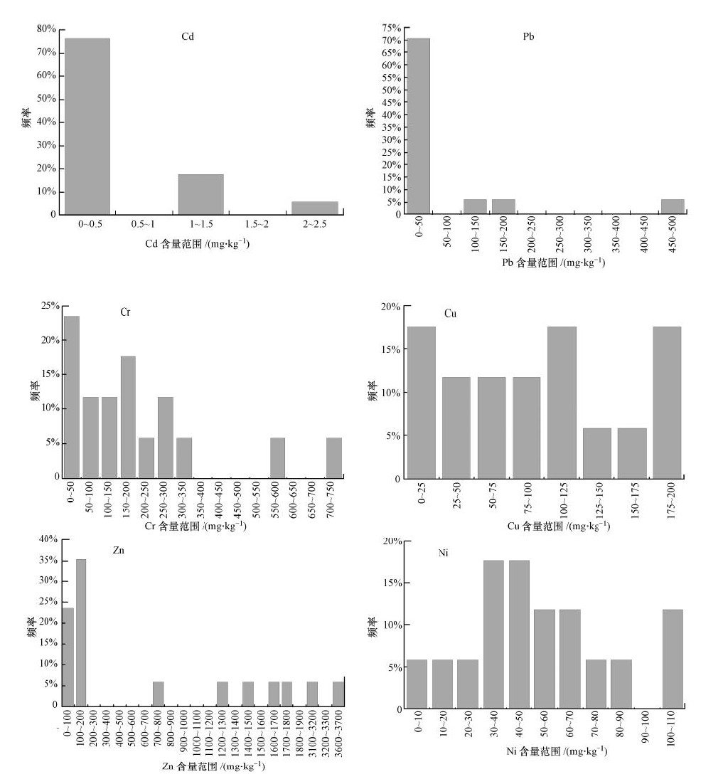 為更好地反映江蘇省印染污泥的重金屬情況,圖 3統(tǒng)計(jì)分析了6種重金屬的分布情況.可以看出,17家印染污泥中,76%的印染污泥中含Cd量在0.5 mg · kg-1以內(nèi),70%的污泥中含Pb量在50 mg · kg-1以下,污泥中的Zn含量大多在200 mg · kg-1以內(nèi)且53%集中在90~120 mg · kg-1之間,Cr、Cu和Ni的含量分布相對均勻.