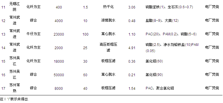 17家印染污水處理廠中,3家以棉布印染廢水為主,4家以化纖印染廢水為主,1家以牛仔印染廢水為主,剩余9家則綜合了棉、麻、絲、化纖、牛仔等多種類型廢水.各處理廠的規(guī)模大小不等,污水日處理量為400~50000 t · d-1,相應(yīng)的脫水污泥產(chǎn)量為10~100 t · d-1,表 1給出了17家印染污水廠的基本情況.