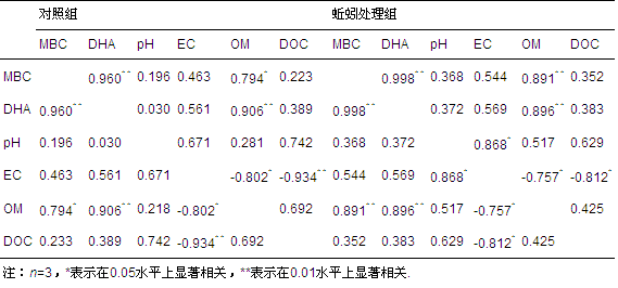 表 1 對照組和蚯蚓處理組MBC、DHA、pH、EC、OM、DOC相關矩陣