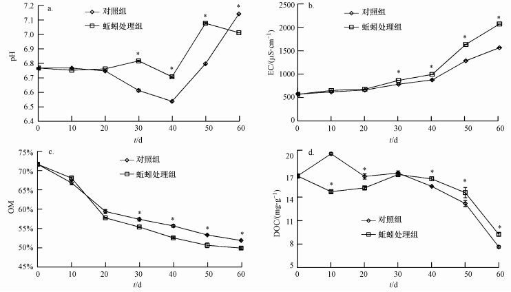 在整個實驗過程中,蚯蚓處理組與對照組的pH、EC、OM、DOC隨時間的變化如圖 1所示.實驗前20 d,蚯蚓處理組與對照組的pH、EC、OM均無顯著差異(p>0.05),20 d后呈顯著差異(p<0.05).由圖 1a可看出,pH穩定在7左右,蚯蚓處理組比對照組pH變化范圍小,表明蚯蚓處理組污泥平抑有機酸與氨化作用的能力較強.基質代謝產物的積累會影響反應體系的pH,pH的變化又會對微生物生長繁殖和酶活性產生顯著影響.反應體系pH變化幅度越小,表明代謝產物的不良積累越少,越有利于微生物分解代謝能力及其酶活性的高效發揮.脫水污泥好氧消化過程通常只發生在污泥表面水膜層的微環境中,因此,將實驗污泥造粒(約5 mm)來增加污泥表面水膜層的面積,通過每日翻混保證反應體系中氧的供給,使降解過程更近似于活性污泥法的延續,因此,代謝產物積累速率緩慢,這可能是20 d后pH才發生變化的原因.圖 1b中蚯蚓處理組較對照組的EC高,說明蚯蚓的參與能提高污泥礦化速率.圖 1c表明,蚯蚓可加快OM的降解,蚯蚓與微生物協同作用效果優于微生物單獨作用.由圖 1d可看出,前20 d蚯蚓處理組DOC小于對照組且呈顯著差異(p<0.05),40~60 d蚯蚓處理組DOC大于對照組且呈顯著差異(p<0.05).由于DOC表征微生物易利用的有機碳,其含量與微生物量及活性有密切關系(衛東等,2011).前期蚯蚓處理組DOC低可能是因為蚯蚓的刺激作用促進了微生物量的增長,從而加快了對DOC的利用.而后期蚯蚓處理組DOC較高可能源自蚯蚓攝食對微生物量的限制,減小了對DOC的利用.