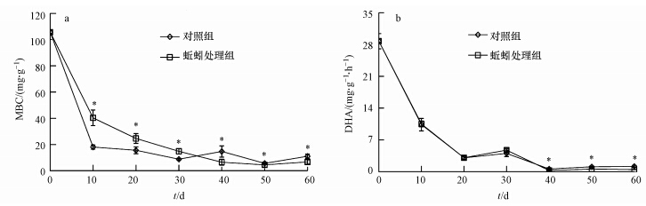 圖 2a顯示,前30 d蚯蚓處理組MBC顯著高于對照組(p<0.05),之后又顯著低于對照組(p<0.05),穩定在4.45~6.49 mg · g-1之間.這可能是因為前期蚯蚓黏液及排泄物對微生物的刺激作用促進了微生物的增長(Aira et al., 2007);而后期隨著營養物質的不斷減少,蚯蚓取食微生物的作用導致蚯蚓處理組MBC顯著低于對照組.