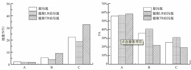 圖 5為不同污泥在分別提取LB-EPS與TB-EPS后絮凝性能的變化.由圖 5可知,有機(jī)負(fù)荷越高,出水濁度越大,F(xiàn)A越小.這是因?yàn)楦哂袡C(jī)負(fù)荷條件下培養(yǎng)的污泥Zeta電位負(fù)電性較大,RH較小.根據(jù)DLVO理論,表面負(fù)電荷增大使細(xì)胞或絮體之間的靜電斥力增大,進(jìn)而導(dǎo)致污泥絮凝能力下降.