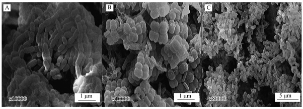 圖 3是采用電子顯微鏡觀察到的不同活性污泥在分別提取LB-EPS和TB-EPS后絮體形態(tài)的變化情況,圖 4是采用掃描電子顯微鏡觀察到的不同污泥的內(nèi)部結(jié)構(gòu).有研究表明自養(yǎng)型的硝化細(xì)菌由于生長較慢,所形成的菌落(microcolonies)是污泥絮體中最密實(shí)的一部分.由圖 3、4可知,污泥A中因存在大量硝化細(xì)菌,細(xì)菌之間排列整齊且結(jié)合緊密,其絮體結(jié)構(gòu)呈規(guī)則的顆粒狀.以異養(yǎng)菌為主的污泥B中體型較小的球菌相互結(jié)合形成長方體菌簇,這些菌簇之間結(jié)合松散,使其絮體結(jié)構(gòu)疏松.污泥C中存在絲狀菌且細(xì)菌之間結(jié)合不緊密使內(nèi)部出現(xiàn)較多孔洞,因此污泥絮體形態(tài)不規(guī)則呈蓬松狀.李志華等通過研究發(fā)現(xiàn)自養(yǎng)顆粒污泥主要通過EPS相互聚集并密實(shí)化,而異養(yǎng)菌顆粒污泥主要通過絲狀菌纏繞的骨架結(jié)構(gòu)實(shí)現(xiàn)聚集和密實(shí)化.由于自養(yǎng)污泥形態(tài)不同(顆粒與絮狀),其聚集和密實(shí)化的機(jī)理也不同.由圖 3可知,當(dāng)提取LB-EPS后,各污泥的絮體結(jié)構(gòu)均未發(fā)生明顯變化,說明LB-EPS對不同污泥絮體結(jié)構(gòu)的形成貢獻(xiàn)較小.當(dāng)提取TB-EPS后,各污泥的絮體形態(tài)出現(xiàn)明顯的差異.污泥A的絮體依舊保持完整的形態(tài)結(jié)構(gòu),說明自養(yǎng)活性污泥之所以能夠形成密實(shí)且規(guī)則的絮體結(jié)構(gòu),并非LB-EPS或TB-EPS的作用,而是自養(yǎng)菌自身具有極強(qiáng)的生物絮凝作用.隨著TB-EPS的提取,污泥B、C中大量的細(xì)胞和菌膠團(tuán)處于游離狀態(tài),絮體中細(xì)胞連接松散,無法形成密實(shí)體.這是因?yàn)門B-EPS的疏水性更強(qiáng),有利于微生物之間的聚集,并且含有大量高分子物質(zhì),可通過架橋和卷掃作用形成絮體.因此可以推斷,TB-EPS在異養(yǎng)活性污泥絮體聚集時(shí)發(fā)揮著主要作用.