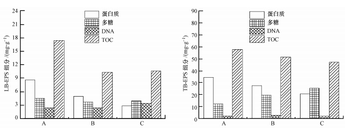 圖 1 不同污泥TB-EPS和LB-EPS組分及含量的差異