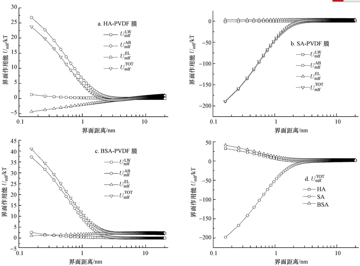 式中,UmlfXDLVO是膜與有機物之間的總相互界面作用能,UmlfLW、 UmlfAB、 UmlfEL分別為LW、AB和EL相互界面作用能(J),下標m、l以及f分別表示平面膜(PVDF超濾膜)、溶劑(超純水)以及有機物(HA、SA和BSA).