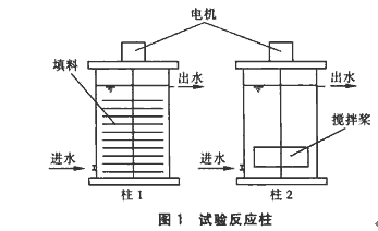 ①試驗采用2只完全相同的有機玻璃柱,有效體積均為30 L(見圖1)。柱1裝有隨中心軸一起轉(zhuǎn)動的彈性立體填料,柱2不裝填料,由攪拌槳攪拌。電機轉(zhuǎn)速為15~20 r/min,柱上方均設(shè)有蓋板。