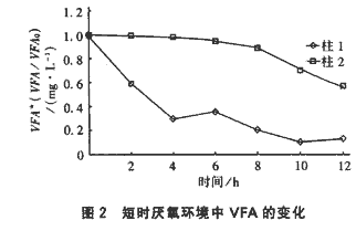 柱1作掛膜運行,HRT=20~30 h,溫度為24~29℃。為了單獨考察城市污水在短時厭氧環(huán)境污水中VFA的變化,試驗未引入小試系統(tǒng)活性污泥。柱內(nèi)微生物完全為厭氧環(huán)境下由污水自然接種生長起來的厭氧或兼性細菌,顯然其厭氧程度較一般脫氮除磷系統(tǒng)的厭氧區(qū)更為充分。柱2作為對比,未作任何處理。正式試驗時,將兩柱瞬時放空,注入新鮮污水,然后啟動電機,每隔2h取樣,分析污水中VFA隨時間的變化規(guī)律,結(jié)果見圖2。