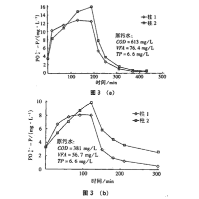 本試驗所采用的 HRT =2~3 h(這與生物除磷工藝厭氧區(qū)的HRT相近),污水 COD 僅500mg/L左右。在這樣的條件下,柱內(nèi)實際上很難造就類似污泥消化那樣的厭氧環(huán)境并培養(yǎng)出大量的專性厭氧菌,生物膜上的微生物主體仍為消耗VFA的兼性細菌,故而柱1的VFA數(shù)量不僅沒有增加,反而消耗很快。柱2完全為污水,其微生物數(shù)量較少,所以其VFA在很長一段時間內(nèi)基本上保持恒定。只是在一定時間以后,隨著微生物的增殖,VFA才出現(xiàn)明顯下降。本試驗說明,就一般城市污水而言,短時厭氧區(qū)不會增加污水中VFA的量。