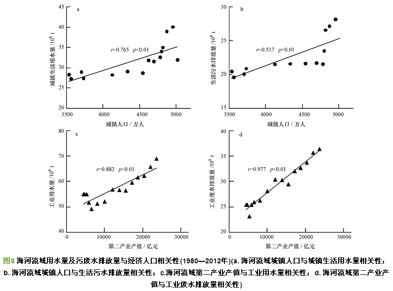 中部平原區城市化發展對水資源的需求急劇增加,侵占河道天然徑流,進一步導致平原區徑流量的減少.1980—2012年海河流域地表水平均開發利用率達63%,水資源總量平均開發利用率高達102%.各水系1980—2012年地表水平均開發利用率44%~84%(圖 6),其中海河北系地表水開發利用率最高,達84%;徒駭馬頰河地表水開發利用率最低,為44%.國際上通常認為,地表水資源利用率超過30%即會對生態環境造成影響,超過40%則對生態環境有嚴重影響,水資源開發利用不可持續.海河流域在我國七大流域中水資源開發利用率最高,河道生態用水最為短缺.工業產值及城鎮人口數量與水資源開發利用率有顯著的相關性(圖 7),復相關系數均超過50%(p<0.01),表明海河流域經濟發展和城市人口規模的擴大導致水資源開發利用率提高.海河流域對水資源的需求已遠遠超過流域水資源的承載能力,導致水資源量持續短缺.海河流域人口和社會經濟快速發展,對水資源的需求也急劇增加,產生了大量的污廢水,是海河流域河流非常規水源補給形成的另一個主要原因.中部平原地區城市密集(圖 5c ),流域經濟產值和人口數量都有明顯增長,總人口由1980年的9721萬人增加至2012年的1.56億,城鎮人口由1980年的2289萬人增加至2012年的7693萬人,流域經濟總產值由1980年的1592億元增加至2012年的49600億元.對1980—2012年流域用水量、污廢水排放量與城鎮人口、工業產值做線性回歸,結果表明,工業產值及人口數量與用水量具有顯著的相關性(圖 8);生活污水排放量與城鎮人口數量之間具有顯著相關性(p<0.01),二者復相關系數達58.5%;工業廢水排放量與工業產值之間的線性回歸方程更加顯著(p<0.01),復相關系數高達95.4%.綜合以上分析,海河流域工業產業規模的擴大和城市人口數量的增加直接導致了污廢水排放量的增加.