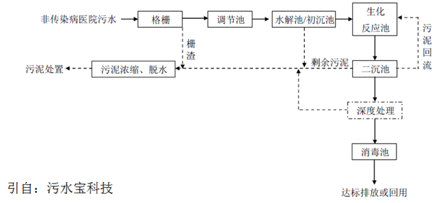 (1)出水直接或間接排入地表水體、海域、或出水回用的非傳染病醫(yī)院污水,一般采用二級(jí)處理+(深化處理)+消毒工藝