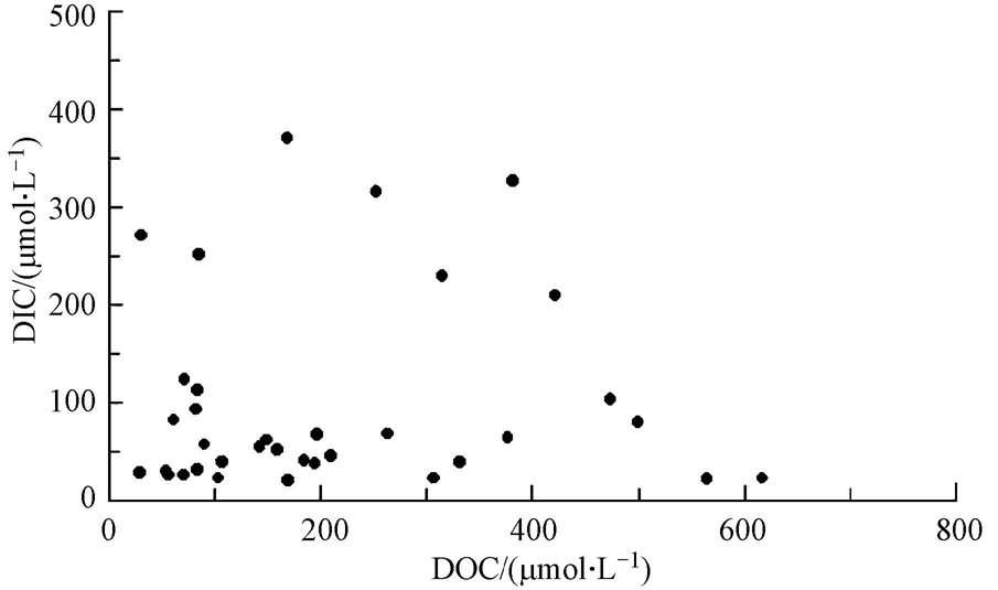 有關雨水中DIC濃度的研究幾乎沒有報道,原因可能是根據氣體溶解定律(亨利定律),當大氣CO2的濃度已知時,CO2在雨水中的溶解度可以很容易計算得到.如在沒有任何其它污染的情況下,以目前大氣CO2 濃度400 ppm,并以雨水pH=5.0計算,在10 ℃達到平衡狀態時,雨水中CO2的飽和溶解度大約在14 μmol · L-1.根據這種計算,Willey等估算得到全球降雨中DIC的通量為80 Tg,相當于降雨中DOC通量的18.6%.
