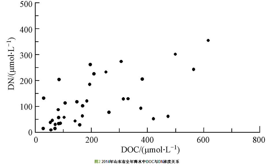 圖1 2014年山東省全年降水中DOC與DIC濃度關系