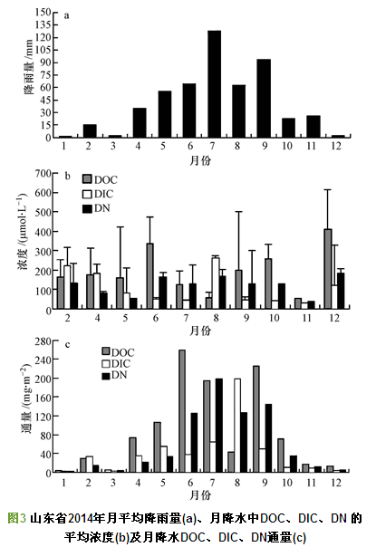 通過計算降雨中溶解碳和氮的通量,可以定量地了解降雨過程在碳和氮循環中的重要性.圖 3a中列出了山東2014年每月的平均降雨量,2014年山東省降雨量偏少,平均為512 mm,較過去10年的平均降雨量(710 mm)減少了28%;且主要集中在5—9月,7月份降雨量最大達134 mm,主要是受到第10號臺風麥德姆的影響;1、3和12月全省范圍基本沒有明顯的降雨.需要說明的是,本文在青島和煙臺兩地采集的雨水樣品基本代表了全年(除8月外)各月份的降雨過程,8月份由于青島和煙臺沒有明顯的降雨過程,主要由泰安采集的雨水代表.圖 3b列出了各月的DOC、DIC和DN平均濃度,有的月份降雨中各組分的濃度變化較大,造成較大的平均濃度誤差.根據各月份的平均濃度,本文計算了山東2014年各月份降雨中DOC、DIC和DN的通量(圖 3c,1月和3月通量利用全年平均濃度計算),結果顯示,降雨中DOC的最大通量主要集中在6、7、9月(194~260 mg · m-2),占全年降雨DOC通量的65%;DIC 最大通量出現在8月(200 mg · m-2),占全年通量的40%;而DN最大通量主要集中在6—9月(125~200 mg · m-2),占全年通量的82%.降雨中DOC、DIC和DN的輸送通量與降水量呈正相關,山東2014年6—9月為汛期,而冬季(12—3月)通常降水量較少,DOC、DIC、DN的輸送通量也很低.