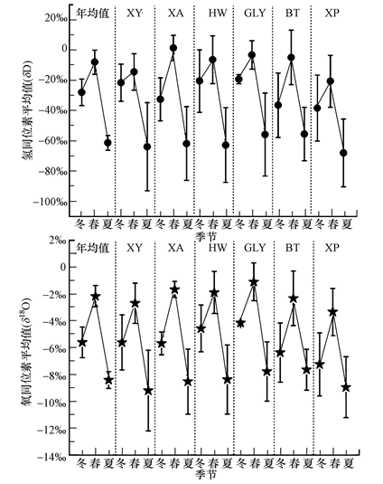 圖 5為廈門地區(qū)降水氘剩余值變化趨勢,其中,氘剩余值(d值)用方程d=δD-8δ18O來表示.d值的大小相當(dāng)于某一地區(qū)降水線斜率ΔδD/Δδ18O為8時的截距,可直觀地反映該地區(qū)大氣降水蒸發(fā)、凝結(jié)過程的不平衡程度.一般而言,降水水汽來源于空氣相對濕度越低的干燥地區(qū),其不平衡蒸發(fā)越強(qiáng)烈,d值越高;而相對濕度越大的濕潤地區(qū),蒸發(fā)作用小,d值則越小.由圖 5可知,廈門地區(qū)d值波動范圍較大,在-5.13‰~32.25‰范圍內(nèi)變化,說明廈門地區(qū)降水的水汽來源較為多樣,降雨條件較為復(fù)雜.廈門地區(qū)降水的d值的平均值為10.95‰±1.77‰,略高于全球d平均值(10‰).總體上,廈門地區(qū)全年d平均值表現(xiàn)為冬季最高,春季次之,夏季最低,甚至出現(xiàn)負(fù)值.綜合HYSPLIT軌跡模型的分析,廈門地區(qū)d值出現(xiàn)夏低冬高的規(guī)律,主要與其水汽來源有關(guān),夏季的水汽氣團(tuán)主要來自西太平洋和南海濕潤地區(qū),來自這些地區(qū)的氣團(tuán)濕度大、蒸發(fā)弱,則d值較低;而冬季則來自于干燥的亞歐大陸、俄羅斯地區(qū),此外還有近地源(華中地區(qū))的影響,來自這些地區(qū)的氣團(tuán)濕度小、蒸發(fā)大,則d值較高.由圖 5還可知,春季降水d值在部分采樣點(diǎn)(如XY和GLY)表現(xiàn)出較低值,這可能與春季有一場來自于南海濕潤地區(qū)氣團(tuán)貢獻(xiàn)的降水有關(guān)(圖 3).理論上,大尺度的水氣循環(huán)中,廈門地區(qū)6個采樣點(diǎn)受到相同的水汽源的影響,應(yīng)表現(xiàn)為相同的d值,而圖中表現(xiàn)為不同采樣點(diǎn)相同季節(jié)d值的差異.這與不同采樣點(diǎn)周圍環(huán)境的差異(如濕度、溫度)導(dǎo)致其影響水汽二次蒸發(fā)的程度不同,從而表現(xiàn)為不同采樣點(diǎn)相同季節(jié)d值的差異.