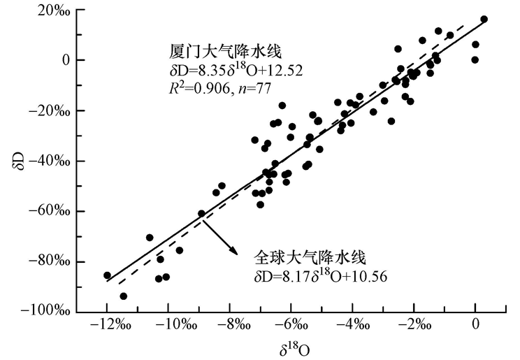2)廈門當(dāng)?shù)卮髿饨邓方程為δD=8.35δ18O+12.52,截距及斜率相較于全球大氣降水線(δD=8.1718O+10.56)和全國大氣降水線(δD=7.9δ18O+10.56)均略有偏高.匯總我國大氣降水線,總體表現(xiàn)為南方地區(qū)(主要包括華東、華南和華中地區(qū))大氣降水線的斜率及截距大于全球大氣降水線,而北方地區(qū)(主要包括東北、華北地區(qū))則相反,反映出南方地區(qū)空氣濕潤多雨,北方地區(qū)干燥少雨的特點(diǎn).廈門位于濕潤多雨的南方地區(qū),大氣降水線一般表現(xiàn)為斜率及截距高于全球大氣降水線,在受到二次蒸發(fā)作用的影響大氣降水線也有表現(xiàn)為斜率和截距低于全球大氣降水線的情況.