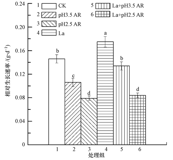 圖1 鑭對酸雨脅迫下水稻相對生長速率的影響(圖中數據為平均值±標準誤差,不同字母表示各處理間差異顯著(p<0.05),下同)