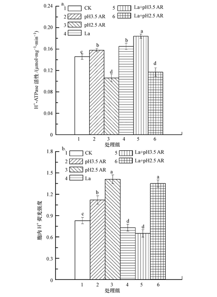 胞內H+熒光強度增強表明胞內H+增多.由圖 2b可知,單一AR組水稻葉片胞內H+熒光強度較CK分別升高34.12%(pH=3.5)、69.88%(pH=2.5).單一La組胞內H+熒光強度較CK降低12.04%.La+pH 3.5 AR組水稻葉片胞內H+熒光強度較CK和單一pH=3.5 AR組分別降低21.69%和41.96%,結合質膜H+-ATPase活性變化可知,可能是由于質膜H+-ATPase活性升高,胞內過多的H+被泵至胞外,維持了細胞內環境的穩定,使水稻恢復生長.La+pH 2.5 AR組水稻葉片胞內H+較CK升高38.52%,而與單一pH=2.5 AR組無顯著差異,分析可能是由于質膜H+-ATPase活性受抑制,大量H+在胞內積累,使水稻的生長受到抑制.表明La調節植物耐酸性與調控質膜H+-ATPase活性有關,調控效果受AR強度限制.