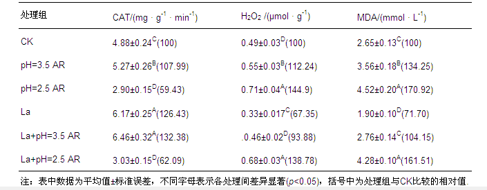 表1 鑭對酸雨脅迫水稻葉片中CAT活性、H2O2和MDA含量的影響