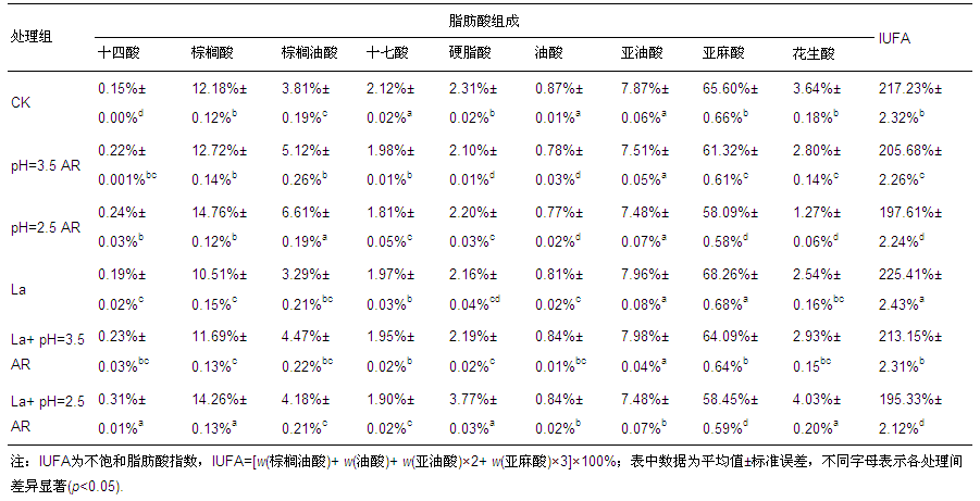 脂肪酸不飽和度指數可用來表征脂肪酸的不飽和程度,IUFA升高表示脂肪酸不飽和程度增加.由表 2可知,單一AR組水稻葉片質膜IUFA較CK分別降低5.32%(pH=3.5)和9.03%(pH=2.5);單一La組水稻葉片質膜IUFA較CK升高3.77%.La+pH 3.5 AR組水稻葉片質膜IUFA較CK無顯著差異,但較單一pH=3.5 AR組升高3.32%,結合MDA含量變化可知,La減輕了pH=3.5 AR誘發的膜脂過氧化,質膜流動性增強,使質膜的功能增強,質膜H+-ATPase活性增強.La+pH 2.5 AR組較CK降低10.08%,與單一pH=2.5 AR組無顯著差異,推測可能是La未能減輕pH=2.5 AR誘發的膜脂過氧化,膜通透性增大,導致質膜的功能降低甚至喪失,質膜H+-ATPase活性降低.表明La減輕pH=3.5 AR誘發的質膜過氧化,進而維持質膜的流動性,使質膜H+-ATPase保持較高活性;La未能減輕pH=2.5 AR誘發的質膜過氧化,質膜的流動性降低,質膜H+-ATPase活性受抑未能緩解.