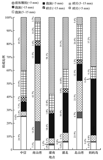 另外,不同尺寸級別的塑料垃圾數量比例也存在差異(圖 1).除南山灣和北山灣以外,其余4個沙灘中微型塑料總數所占比例都較高(高于70%),北山灣和南山灣的塑料垃圾中占比最大的尺寸主要集中在5~15 mm(占比均高于50%),且以泡沫為主.北山灣和中信北部沙灘上的中型塑料碎片(5~15 mm)比例較高,這些都可能成為該地區后期微型塑料污染的潛在來源.
