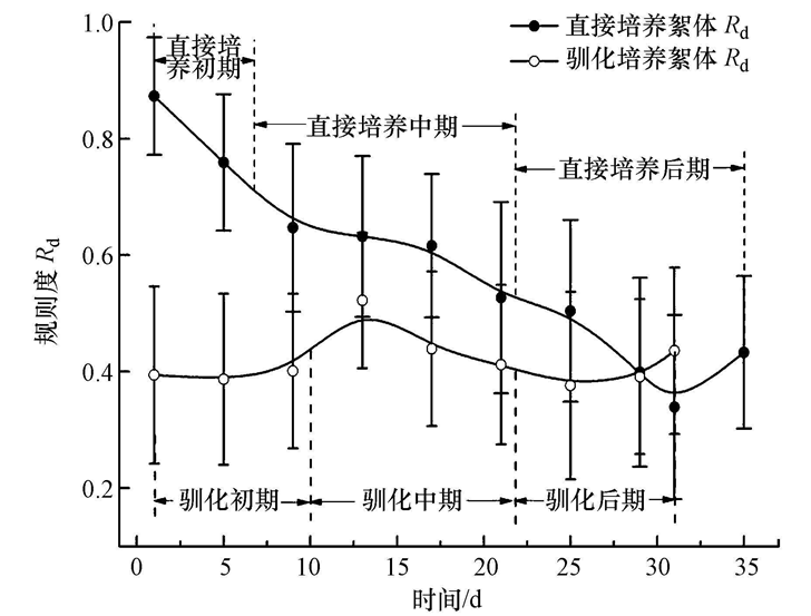 2)直接培養污泥絮體Rd在培養過程中不斷減小,從0.873減小到0.339,絮體形成過程中,絮體的形狀由圓形逐步變成不規則形狀.而馴化污泥絮體Rd變化不大,在0.400~0.520范圍內波動,絮體逐步從不規則形狀的松散結構變成內部結構密實,表面形狀各異的絮體.