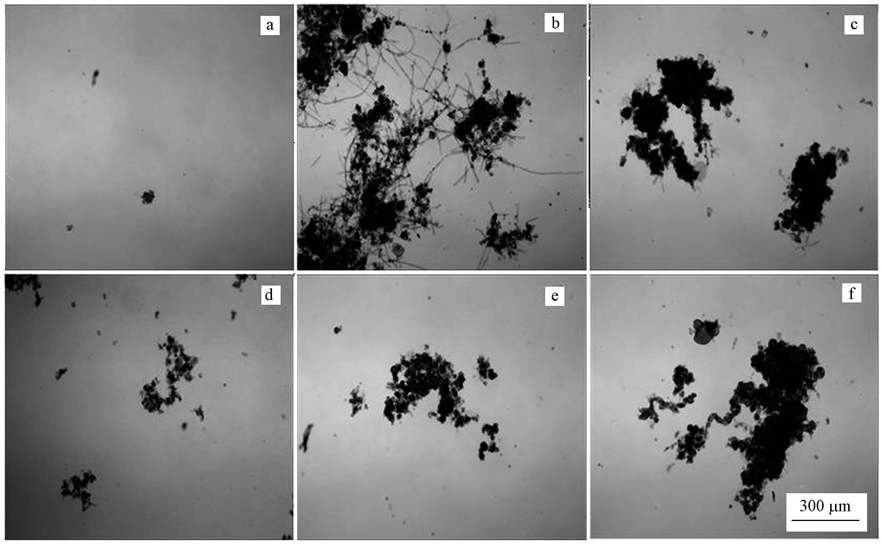 圖4 污泥培養過程中絮體形狀變化(注:直接培養過程絮體,a~c分別為培養5、21、35 d;馴化培養過程絮體d~f為分別為培養5、21、31 d)