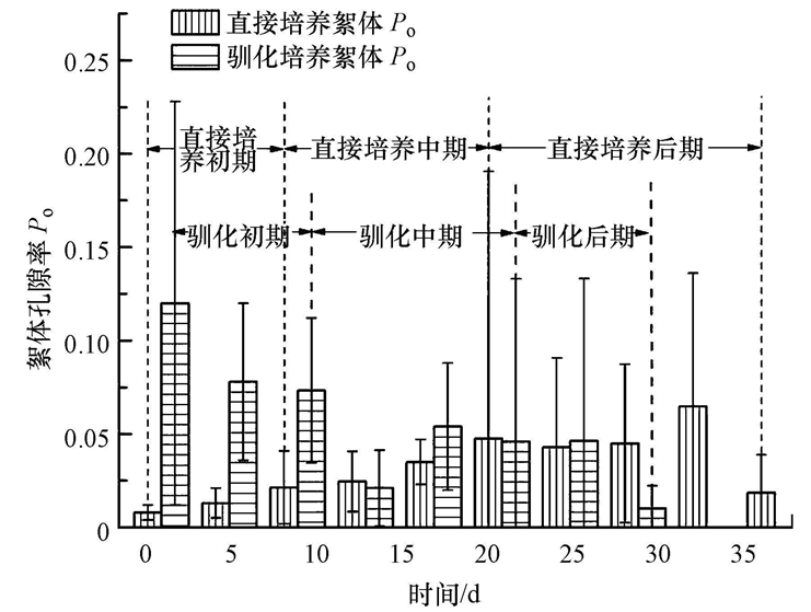 因此,直接培養初期和中期絮體Po呈增大趨勢,馴化培養初期和后期呈減小趨勢,培養成熟后,直接培養的污泥絮體Po小于馴化污泥絮體Po.