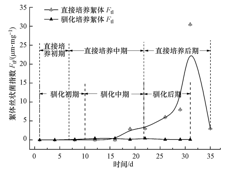 污泥培養過程中的絮體絲狀菌指數(Ftl)變化如圖 6所示.直接培養前16 d和馴化培養整個過程,絮體內絲狀菌含量少(0~0.40 μm · mg-1).這是由于本研究采用純氧曝氣氧含量高,且營養配比合理,而絲狀菌適于在低溶解氧或低負荷環境生長,但是污泥直接培養過程的中期,系統中開始出現大量絲狀菌(圖 4b),到污泥培養的第31 d達到絮體Ftl最大值(30.50 μm · mg-1),污泥容積指數(SVI)為41.90 mL · g-1.產生這一現象的原因,主要由于培養污泥絮體在中后期絮體粒徑增大,結構密實,導致營養物質、氧氣很難傳輸到絮體內部,抑制了常規微生物的生長,絲狀菌獲得更多的營養,快速生長;絲狀菌的生長反過來又促進營養物質、氧氣在絮體內部的流動,致使污泥培養成熟后絮體內絲狀菌數量迅速減少,試驗第35 d系統內絲狀菌指數已恢復到3.00 μm · mg-1.當然,直接培養后期由于絲狀菌大量存在,增加了絮團-絮團絮凝的能力,從而促進絮體Deq迅速增大.