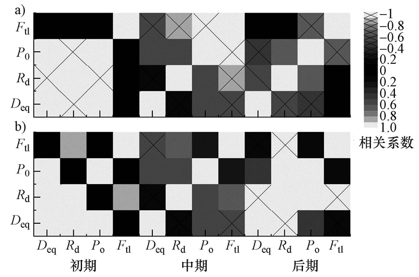 圖7 不同培養階段污泥絮體結構特征參數相關系數矩陣圖(注:a. 直接培養絮體,b. 馴化培養污泥)