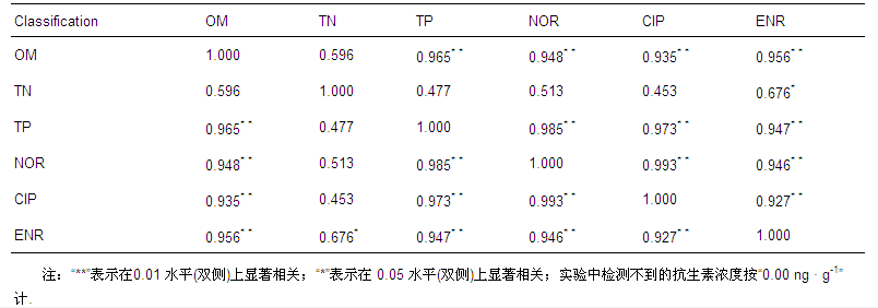 本研究中(表 1和表 2),3種FQs與OM、TP間呈極顯著正相關.S9點位OM含量最高,沉積物中的OM蘊含物質復雜多元,FQs進入水體后會迅速被吸附,因此S9點位測得的3種FQs也最高,這與張勁強等的研究也相符合.Carrasquillo認為FQs有很強烈的吸附固相,能夠強烈吸附在顆粒物和沉積物中(Carrasquillo et al., 2008),可見FQs與沉積物間的相互吸附作用強烈,也可以解釋FQs在沉積物中含量高的原因.