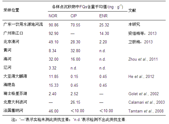 將本研究結果與目前國內外河流沉積物中FQs的含量進行比較,見表 3.