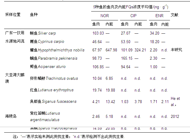 本研究測得5種魚的魚肉中的FQs含量均顯著高于大亞灣大鵬澳和海陵島中魚的FQs的含量;部分魚類魚肉和內臟中NOR、CIP含量高于美國、歐盟的許多國家的殘留標準(殘留限量為30 ng · g-1),也高于我國農業部標準NY 5070—2001《無公害食品水產品中漁藥殘留限量》的殘留標準(NOR、CIP殘留限量為50 ng · g-1).分析原因乃為同上,主要是養殖魚塘、禽畜養殖業、城鎮生活污水及感潮河流的滯留效應,導致面源污染嚴重,水體中可能含有較高的FQs含量.Li的研究表明FQs在可食用的軟體動物內臟中性質穩定(Li et al., 2012);孫言春的研究也表明FQs在魚體內吸收較快,消除較慢,FQs在魚體內富集作用較強.魚內臟部位為代謝器官,因此,更易積累,造成魚內臟中抗生素含量較高的現象.魚體內臟中FQs含量多數情況下高于魚肉中FQs含量,這個結果與He的研究結果一致.