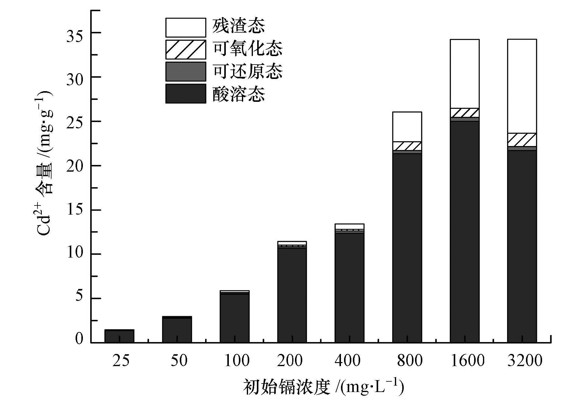 批量等溫吸附實(shí)驗(yàn)結(jié)束后,F(xiàn)ARs中不同形態(tài)Cd2+的含量分析結(jié)果見圖 7.在不同Cd2+初始濃度條件下,F(xiàn)ARs中不同形態(tài)鎘所占比例大體相同,主要存在形態(tài)為酸溶態(tài)和殘?jiān)鼞B(tài).其中,在初始溶液濃度較低時,酸溶態(tài)的鎘為主要存在形態(tài),約占了總吸附量的94%,這可能是因?yàn)殒k被吸附在FARs的表面.但隨著吸附量的升高,酸溶態(tài)的鎘所占比例相對減小,殘?jiān)鼞B(tài)鎘和氧化態(tài)鎘所占比例逐漸增大.與3.4節(jié)對應(yīng)的是,F(xiàn)ARs在酸性條件下最大的解吸率僅為11%左右,說明被FARs吸附的Cd2+釋放風(fēng)險較弱,可作為一種高效的鎘吸附劑.