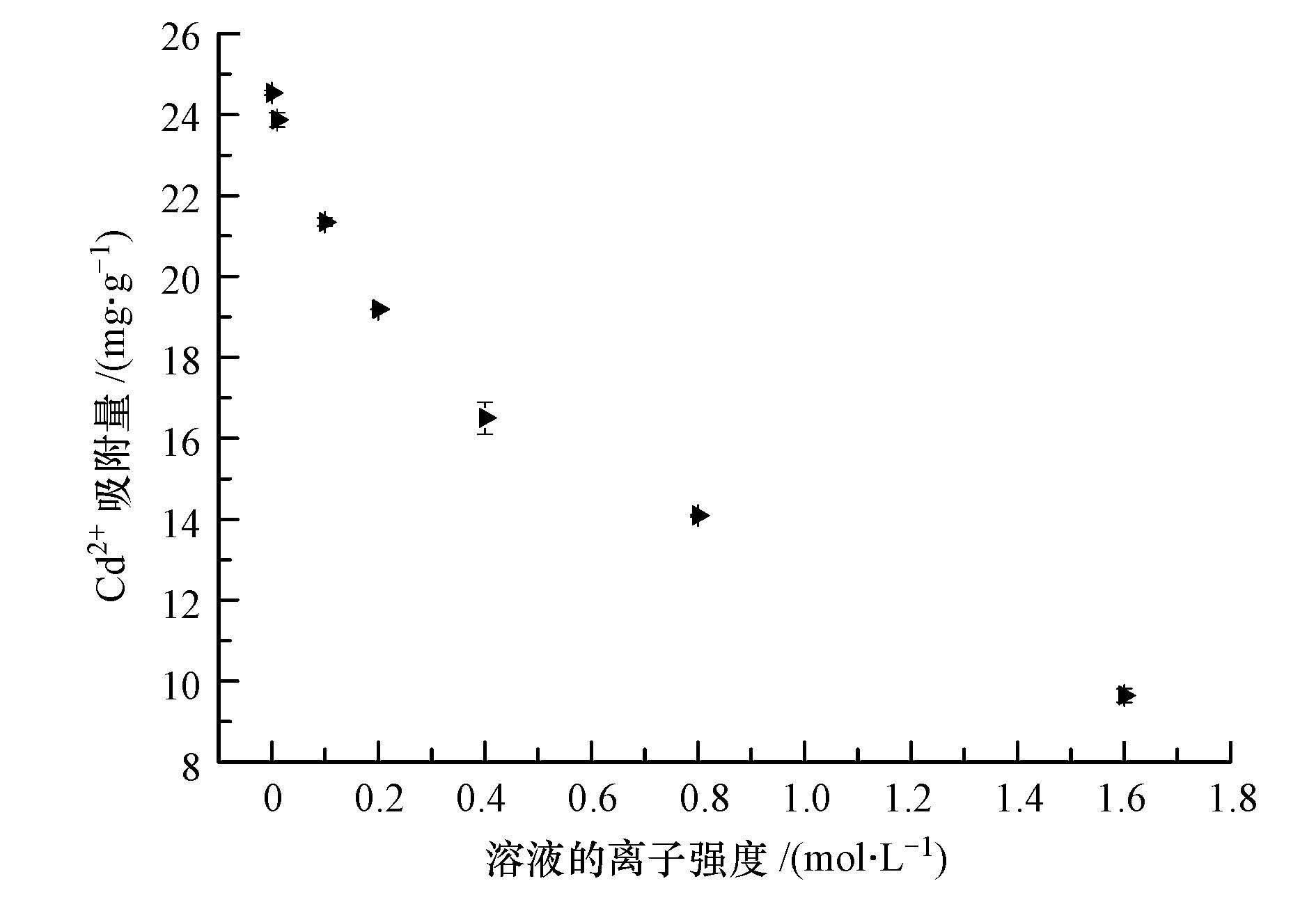 離子強(qiáng)度是影響金屬離子吸附的重要因素,為了了解溶液離子強(qiáng)度對FARs吸附Cd2+的影響,本研究考察了不同濃度的KCl對Cd2+吸附的影響(圖 5).由圖 5可見,F(xiàn)ARs對Cd2+的吸附量隨著體系離子強(qiáng)度的增加而顯著減小.其中,當(dāng)溶液KCl濃度大于0.2 mol · L-1時,F(xiàn)ARs對Cd2+的吸附率已經(jīng)低于50%.因此,隨著溶液離子強(qiáng)度的升高,F(xiàn)ARs對Cd2+的吸附量逐漸降低.這可能是因?yàn)榧尤氲襟w系中的K+與Cd2+產(chǎn)生離子交換競爭,增加離子強(qiáng)度導(dǎo)致吸附量減少;此外,F(xiàn)ARs與Cd2+之間可能存在較弱的非化學(xué)鍵,因此,表現(xiàn)出吸附量隨離子強(qiáng)度的增加而減小.在同一體系中,上述幾種機(jī)制可能共存.