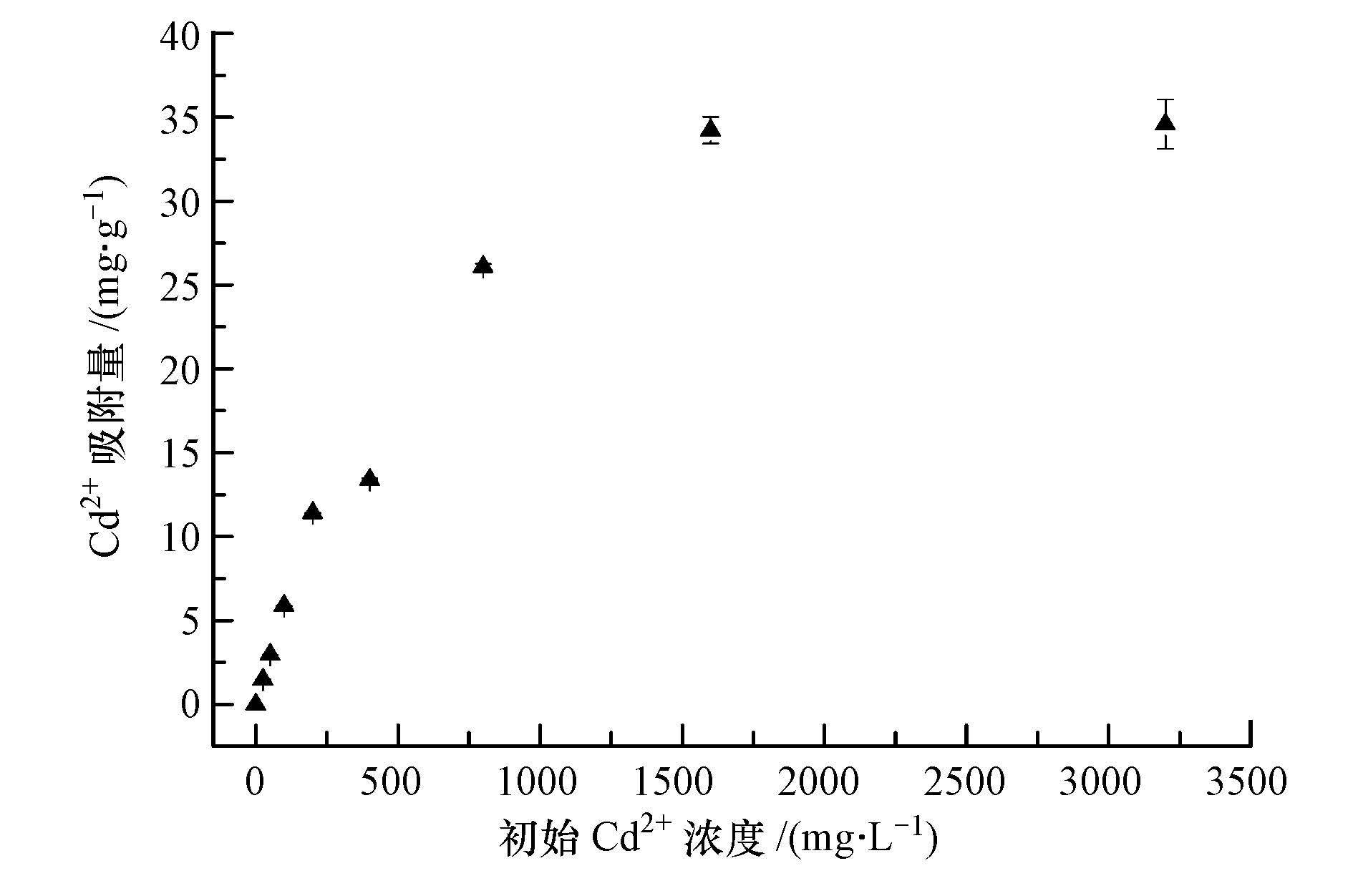 將0.5 g FARs置于不同初始Cd2+濃度(0、25、50、100、200、400、800、1600和3200 mg · L-1)的硝酸鎘溶液(30 mL,pH=6.0,離子強(qiáng)度為0.01 mol · L-1的KCl)中,在25 ℃、150 r · min-1條件下恒溫振蕩24 h,實(shí)驗(yàn)設(shè)3組平行樣和空白對照.