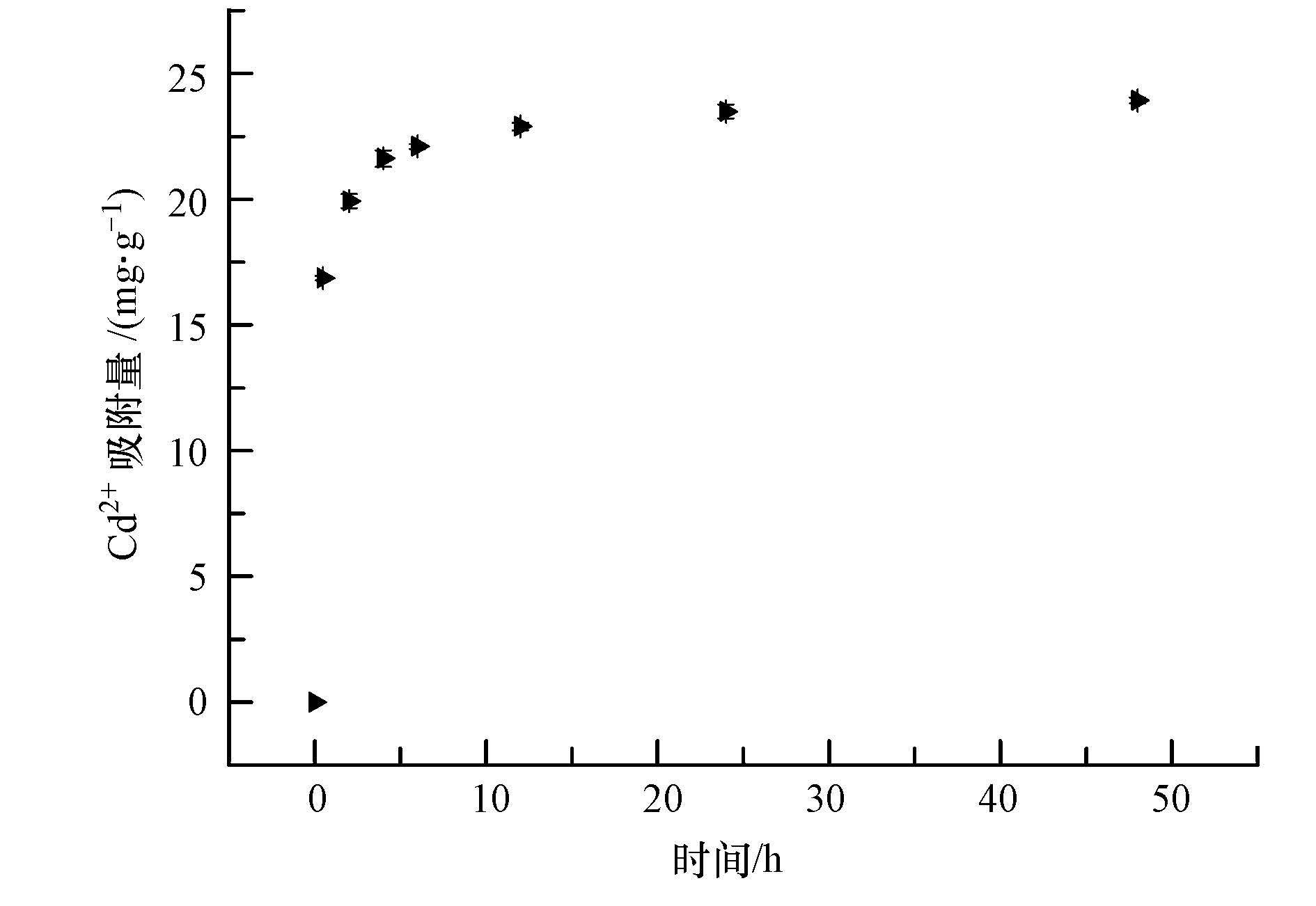 將0.5 g FARs置于初始Cd2+濃度為500 mg · L-1、pH=6.0的硝酸鎘溶液(30 mL,離子強(qiáng)度為0.01 mol · L-1的KCl)中,在25 ℃、150 r · min-1條件下,分別恒溫振蕩0.5、2、4、6、12、24和48 h,實(shí)驗(yàn)設(shè)3組平行樣和空白對照.