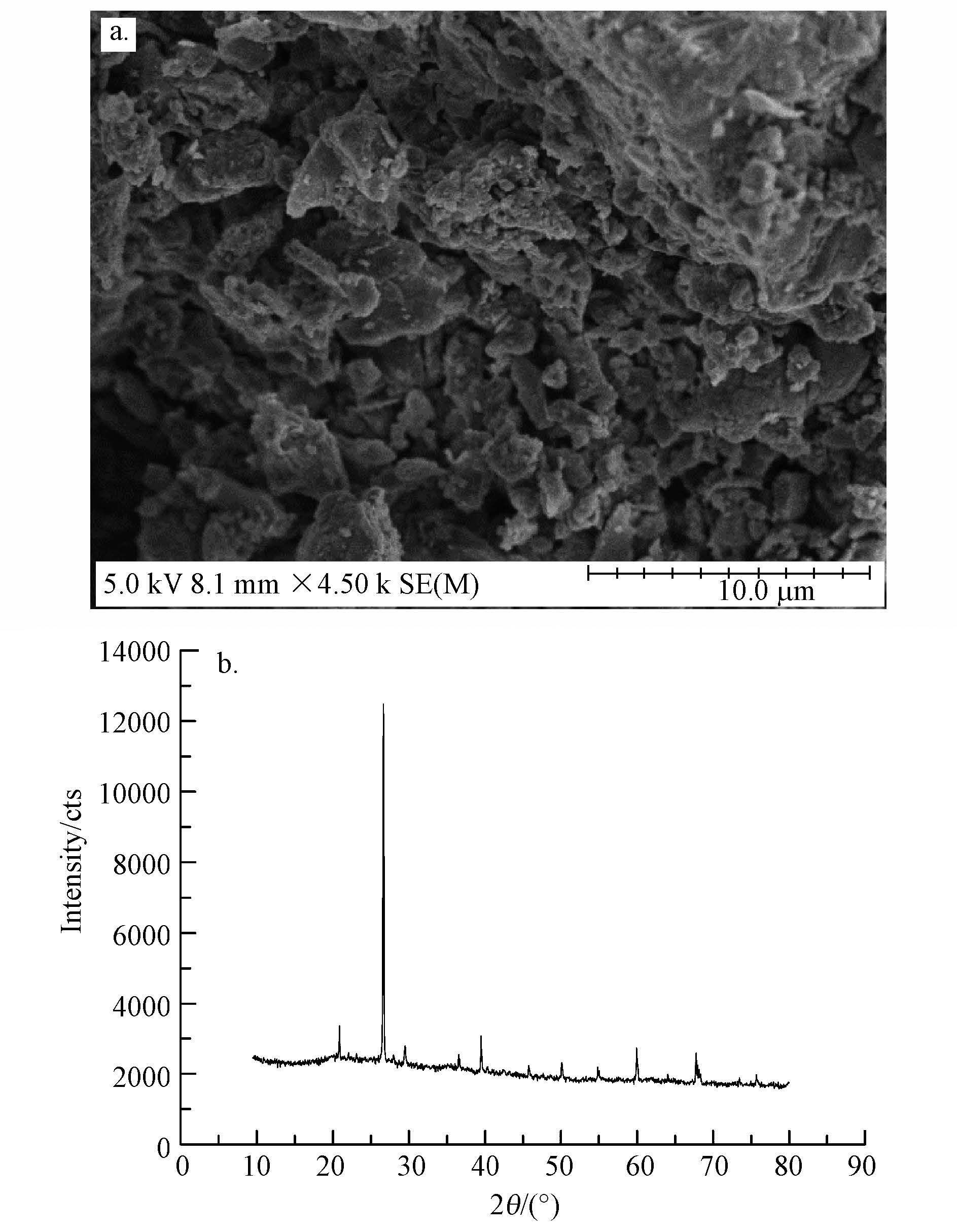 FARs取自北京第九水廠(2014年5月),該廠將鋁鹽和鐵鹽作為絮凝劑.樣品采集后,風(fēng)干并研磨過100目篩備用.FARs中鐵鋁等元素含量根據(jù)USEPA Method 3051經(jīng)酸消解后用ICP(ICP-AES,ULTIA,JY,F(xiàn)rance)測定,結(jié)果見表 1.由表 1可知,F(xiàn)ARs具有較高的鐵鋁含量.電鏡掃描(S4800,日立高新技術(shù)株式會社,圖 1a)和XRD(X′Pert PRO MOD,荷蘭,圖 1b)結(jié)果表明,F(xiàn)ARs表面疏松多孔,僅存在SiO2晶體,且不存在明顯的晶體鐵鋁氫氧化物,即無定形態(tài)鐵鋁占了主要部分.
