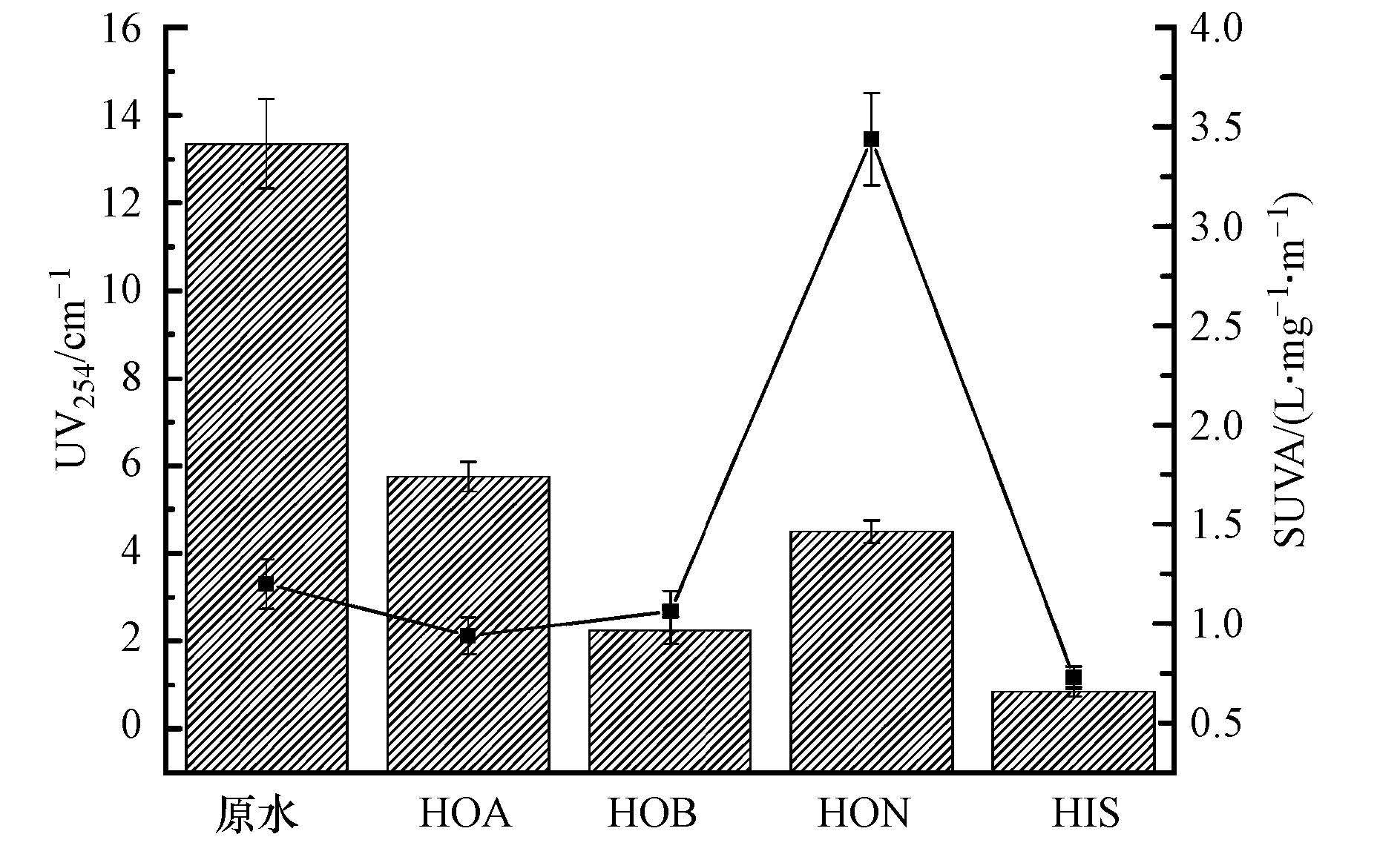 紫外吸收參數UV254和SUVA是用來反映廢水中不飽和物質和芳香性物質的參數(Pala and Erden, 2005).圖 3顯示,焦化廢水的UV254為(13.35±1.02)cm-1,表明廢水中含有大量不飽和芳香物質.4種不同極性組分中,HOA和HON的UV254分別占比43.1%和33.7%,說明這兩類物質是焦化廢水芳香性物質的主要貢獻者.SUVA則反映廢水中有機物的芳香構造化程度,是表達廢水芳香性的量化指標,也經常用來反映廢水的可生化性能(Yapsakli and Çeçen,2010).焦化廢水的SUVA值為(1.19±0.12)L · mg-1 · m-1,這與Park等(2009)報道的廢水SUVA值相近.根據Edzwald的分類標準(Edzwald,1993),焦化廢水中的溶解性有機物中芳香族化合物構造較少,分子量也較低.4種不同極性組分中,只有HON的SUVA值高于原水,為(3.44±0.23)L · mg-1 · m-1,其余3種組分的SUVA值均低于原水,表明HON是焦化廢水中芳香結構有機物濃度相對最高的組分.