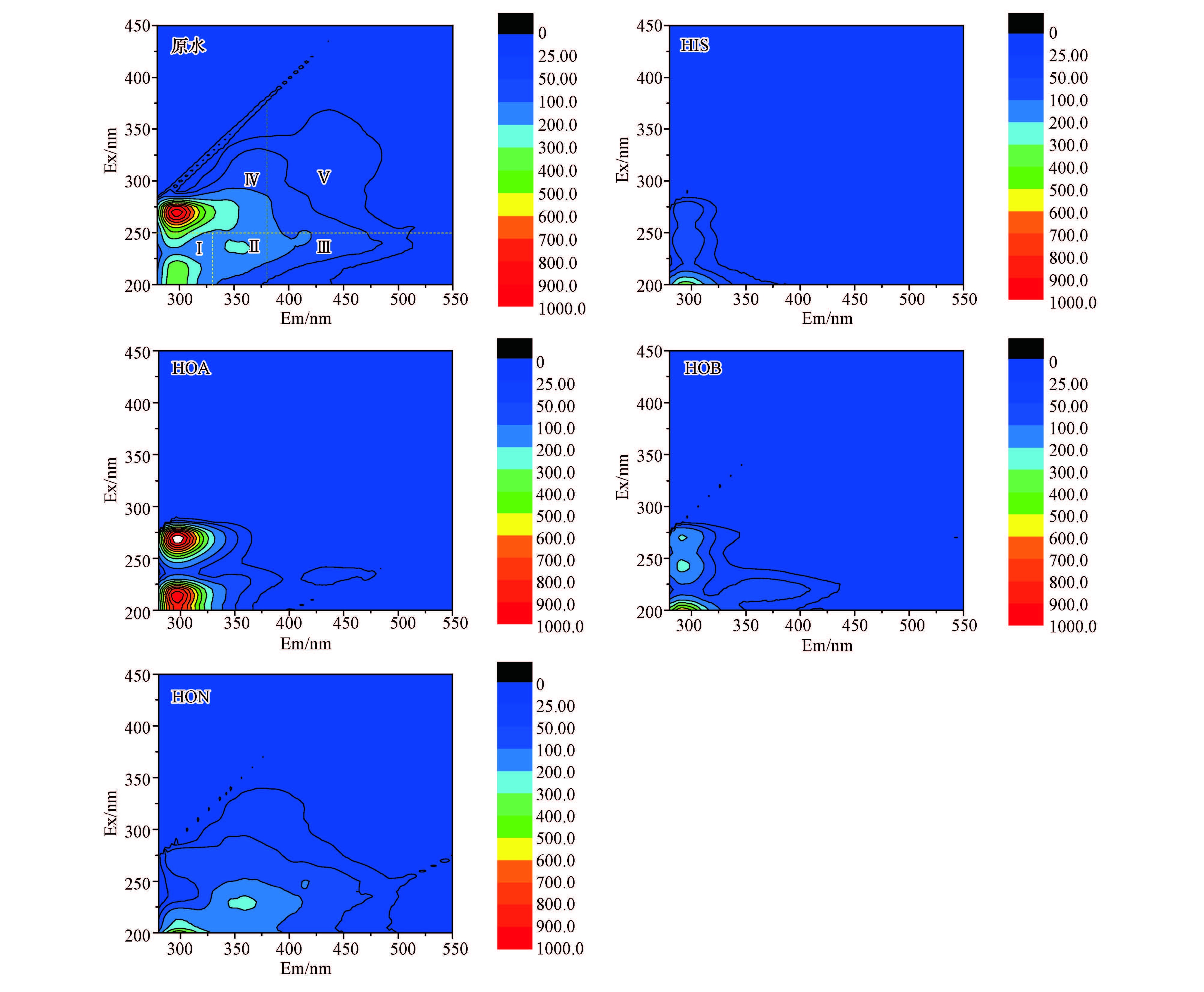 本研究對焦化廢水及分離出的4種極性不同的有機物進行3D EEMs掃描,各水樣的3D EEMs如圖 4所示.根據Coble 提出的“尋峰法”(Coble,1996)來識別熒光光譜,可以看出焦化廢水含有4個明顯不同的熒光峰,分別為峰A-類富里酸(λEx/Em=245/414 nm),峰B1-類酪氨酸(λEx/Em =270/298 nm),峰 B2-類酪氨酸(λEx/Em=210/298 nm)和峰T-類色氨酸(λEx/Em=235/356 nm)(Hudson et al., 2008; Coble,1996).其中熒光峰B1的強度最大,表明焦化廢水中類酪氨酸物質是主要的熒光團,而且類蛋白質的熒光強度顯著高于類腐殖質.4種親疏水性不同的組分中,HOA的整體熒光強度最高,它是焦化廢水熒光強度的主要貢獻者,這與焦化廢水中含有大量的熒光量子產率很高的酚類物質有關.熒光強度較高的是HOB和HON,熒光強度最低的是HIS,表明焦化廢水中親水性物質中熒光團數量最少,這與上述UV254和TOC的結果是吻合的.