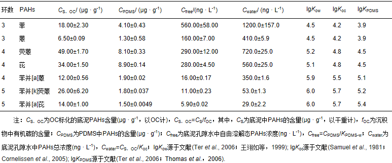 底泥孔隙水中PAHs總濃度(Cwater)可以通過底泥中PAHs總濃度(CS,OC)及底泥有機碳-水分配系數(KOC)計算得到(表 1).然而,Cwater包括Cfree和溶解性有機碳(DOC)結合態濃度(Allan et al., 2012),但結合態污染物因其極性太強或者體積太大不能被生物體吸收,即不具有生物有效性.Hunter等(2009)的研究也表明,只有自由溶解態的分子才能夠穿過生物膜被生物吸收.與上述方法相比,固相微萃取PDMS中只富集自由溶解態的污染物(Mayer et al., 2003),因此,可根據PDMS中污染物的濃度CPDMS和PDMS-水分配系數(KPDMS-w)計算孔隙水中的Cfree,從而更真實地反映孔隙水暴露環境中PAHs的生物有效性濃度.