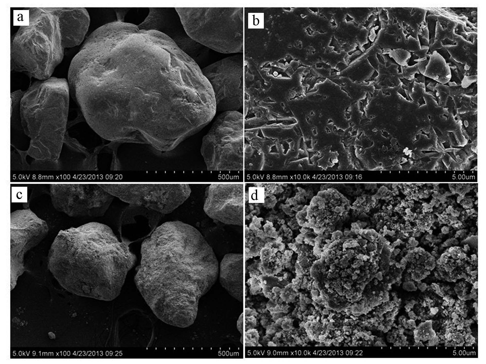 圖1 海砂與包覆海砂的掃描電鏡照片(a. 海砂×100倍; b. 海砂×10000倍; c. 包覆海砂×100倍; d. 包覆海砂×10000倍)