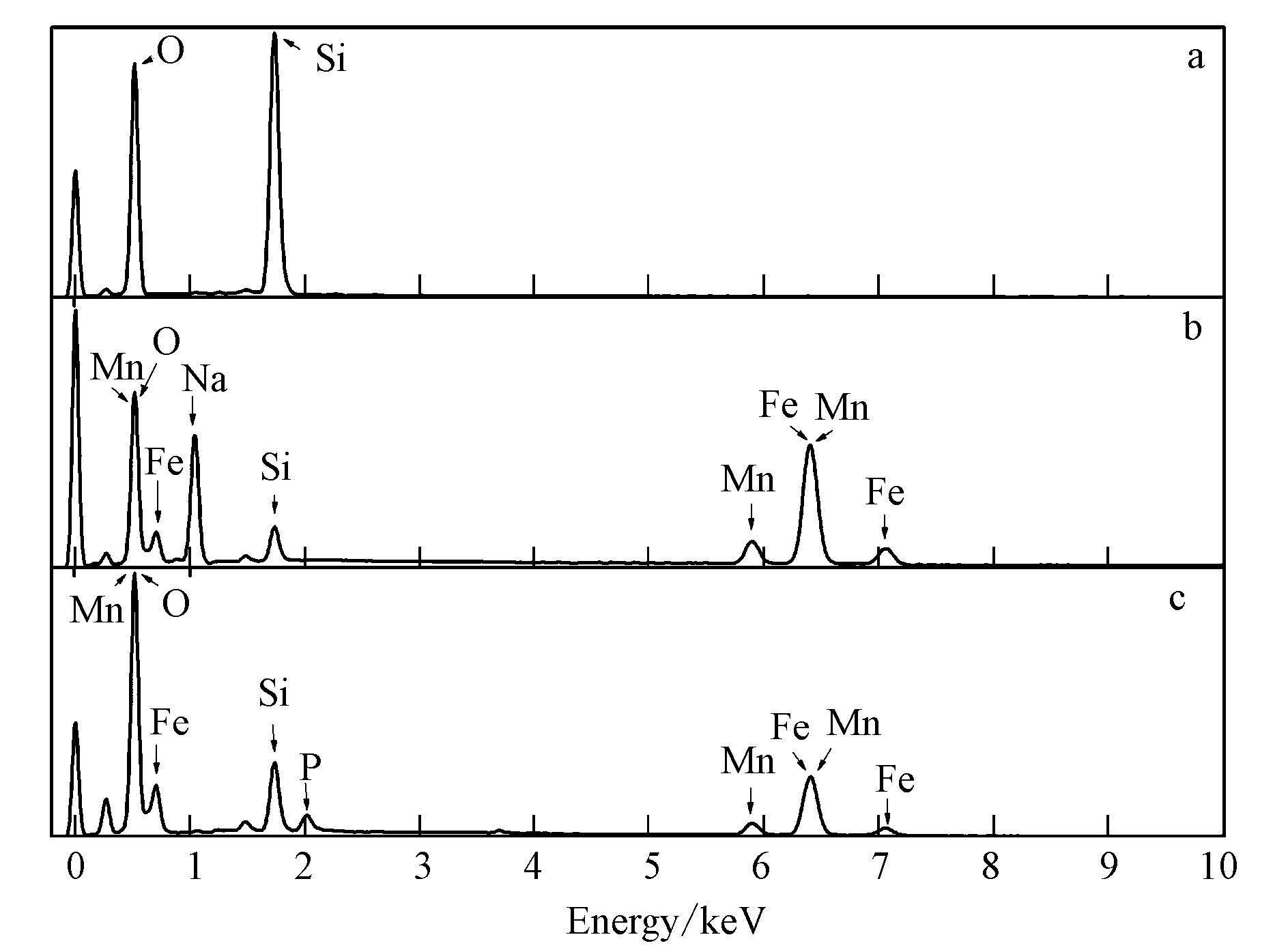海砂與包覆海砂磷吸附前后的EDAX圖譜如圖 2所示. 海砂以硅元素與氧元素為主要成分,包覆鐵錳復合氧化物后,出現了明顯的鐵元素與錳元素的特征峰,表明鐵錳復合氧化物包覆在海砂的表面. 吸附磷后包覆海砂的EDAX圖譜又出現了磷元素的特征峰,表明鐵錳復合氧化物包覆海砂對溶液中的磷具有吸附性能.